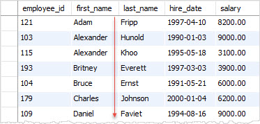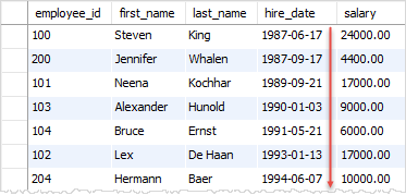 Besides the character and numeric, SQL allows you to sort the result set by date. The following statement sorts the employees by values in the column in the ascending order.